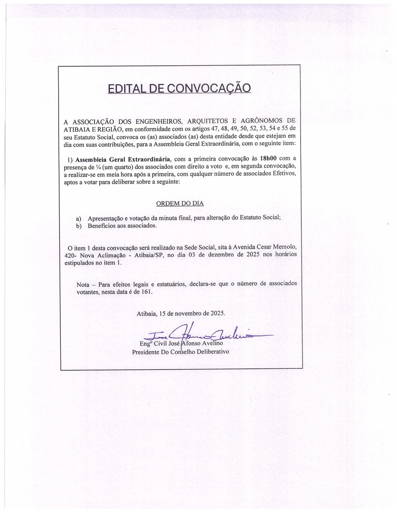 Atenção, associados! No dia 03/12/2025, quarta-feira, será realizada em nossa sede uma assembleia geral extraordinária com a seguinte ordem do dia: