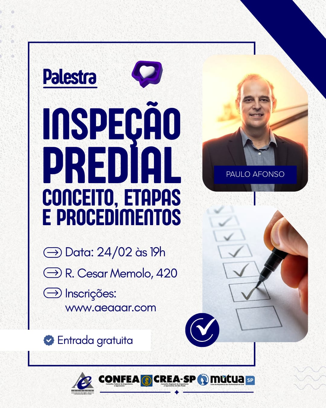 Caros profissionais, não percam a oportunidade de participar de mais uma palestra oferecida por nossa Associação para aprender um pouco mais sobre Inspeção predial, visitando o conceito, etapas e procedimentos a serem observados e seguidos.